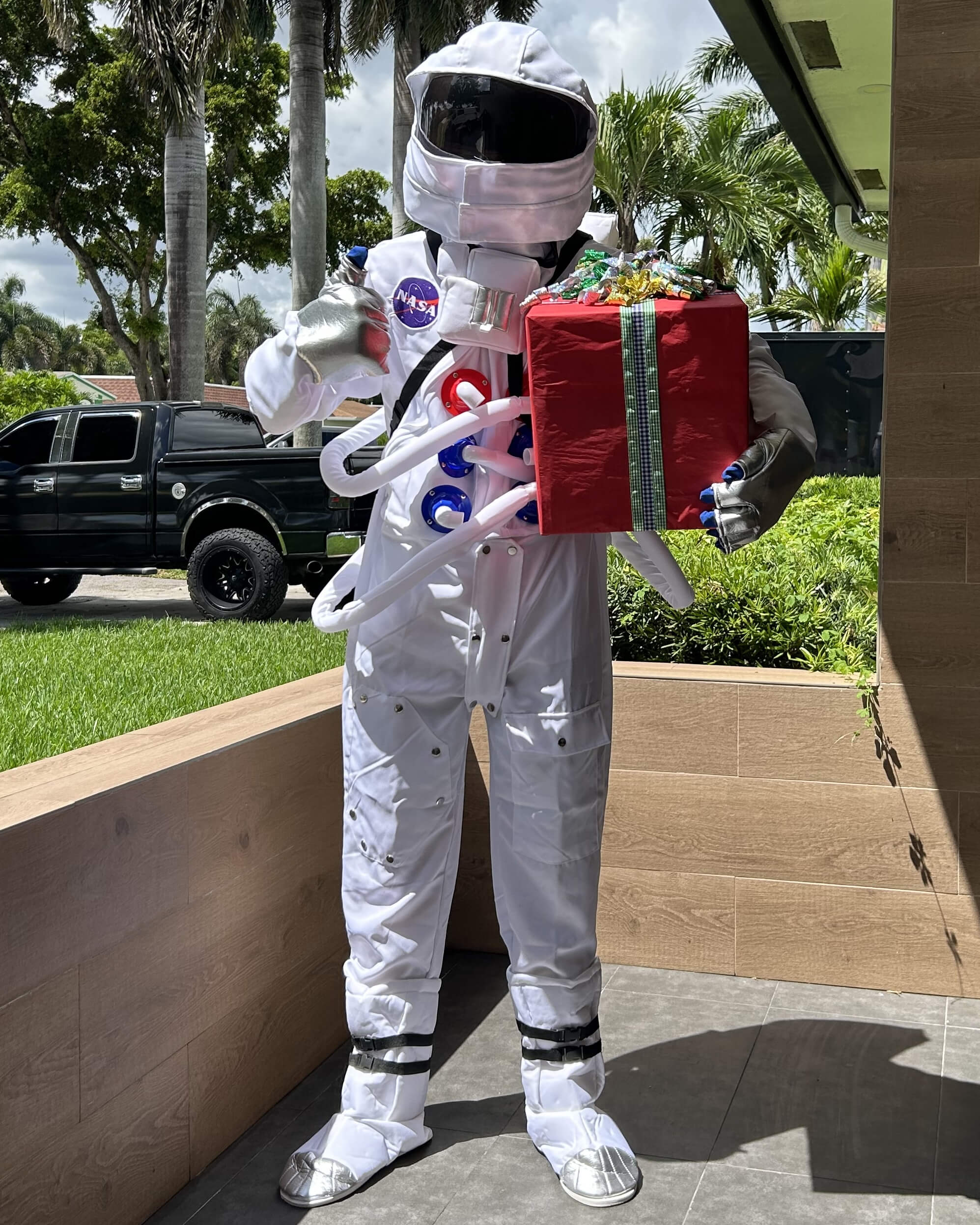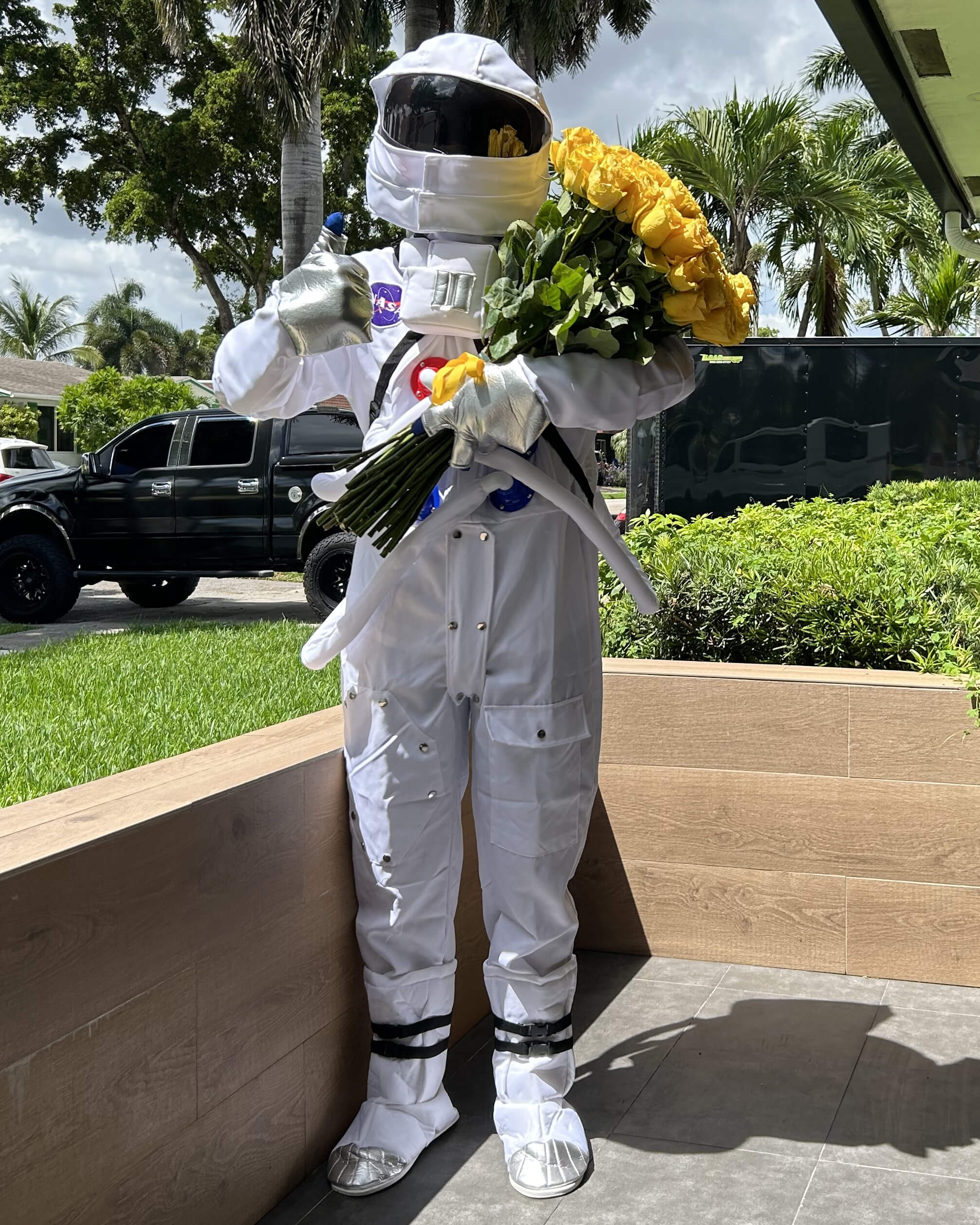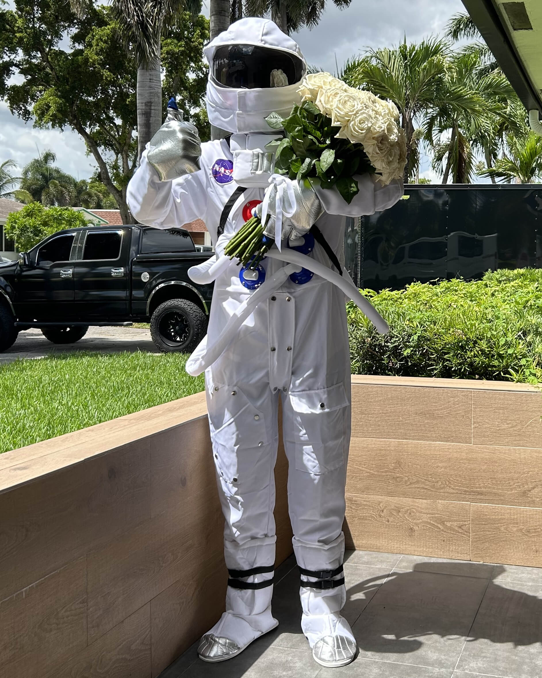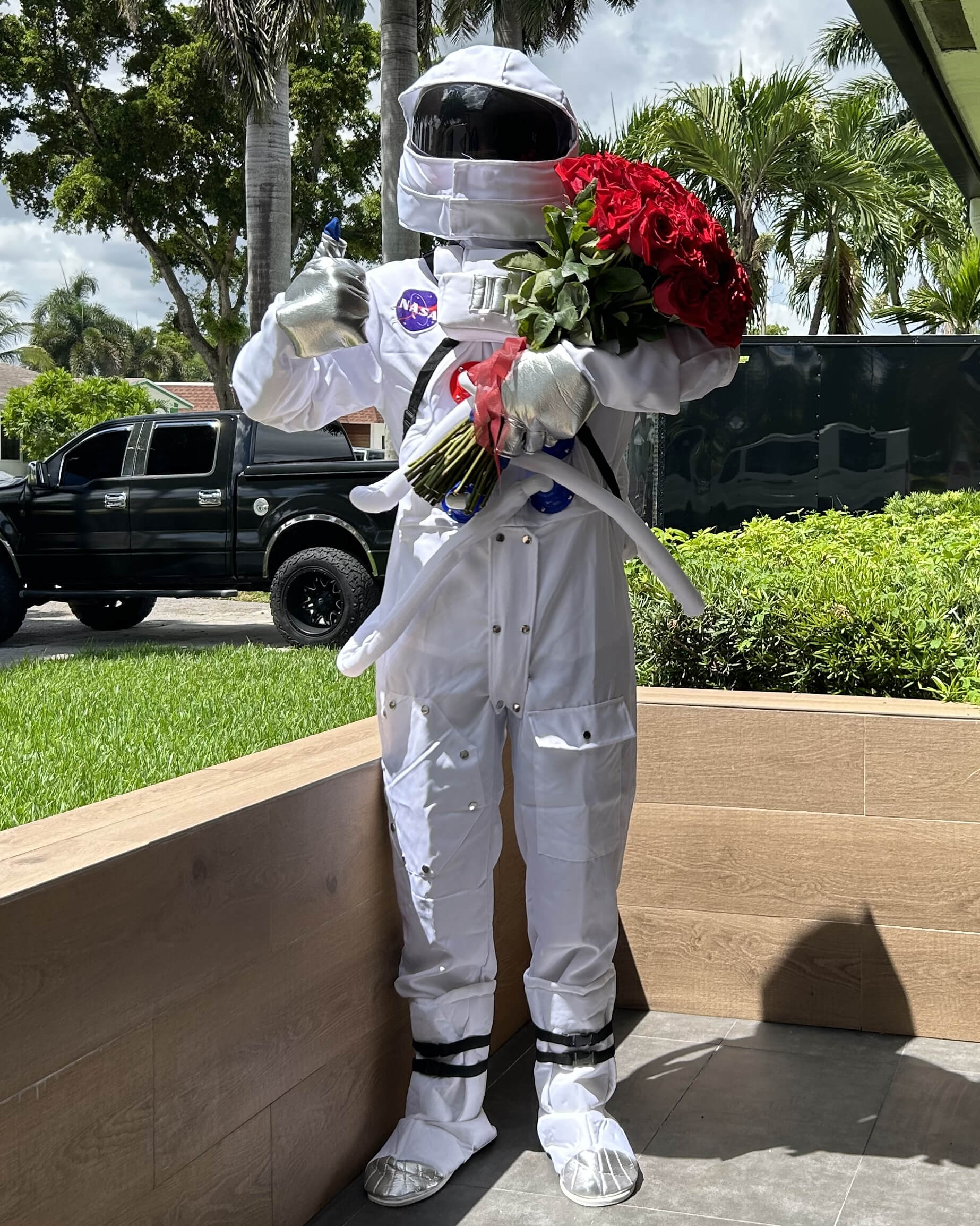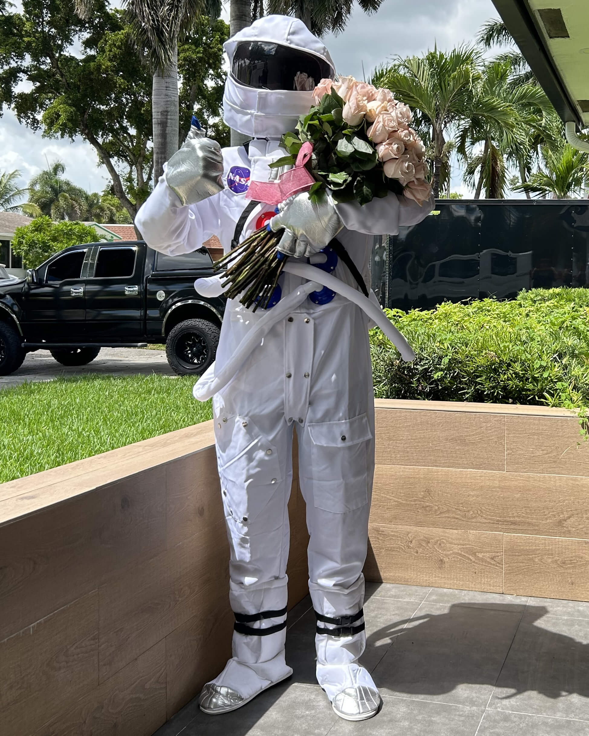 Delivery of fresh roses straight from orbit by a handsome astronaut in a bright white costume!