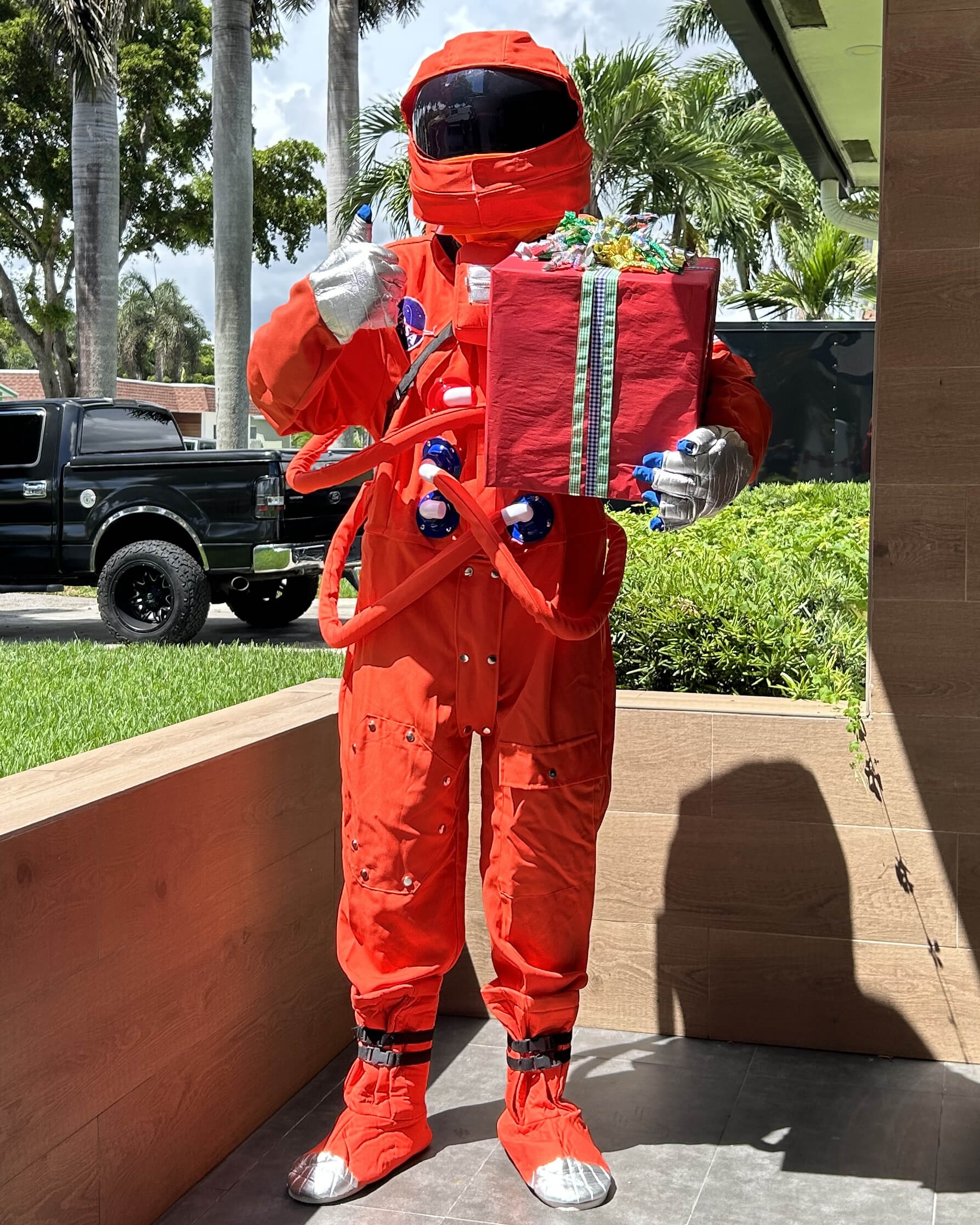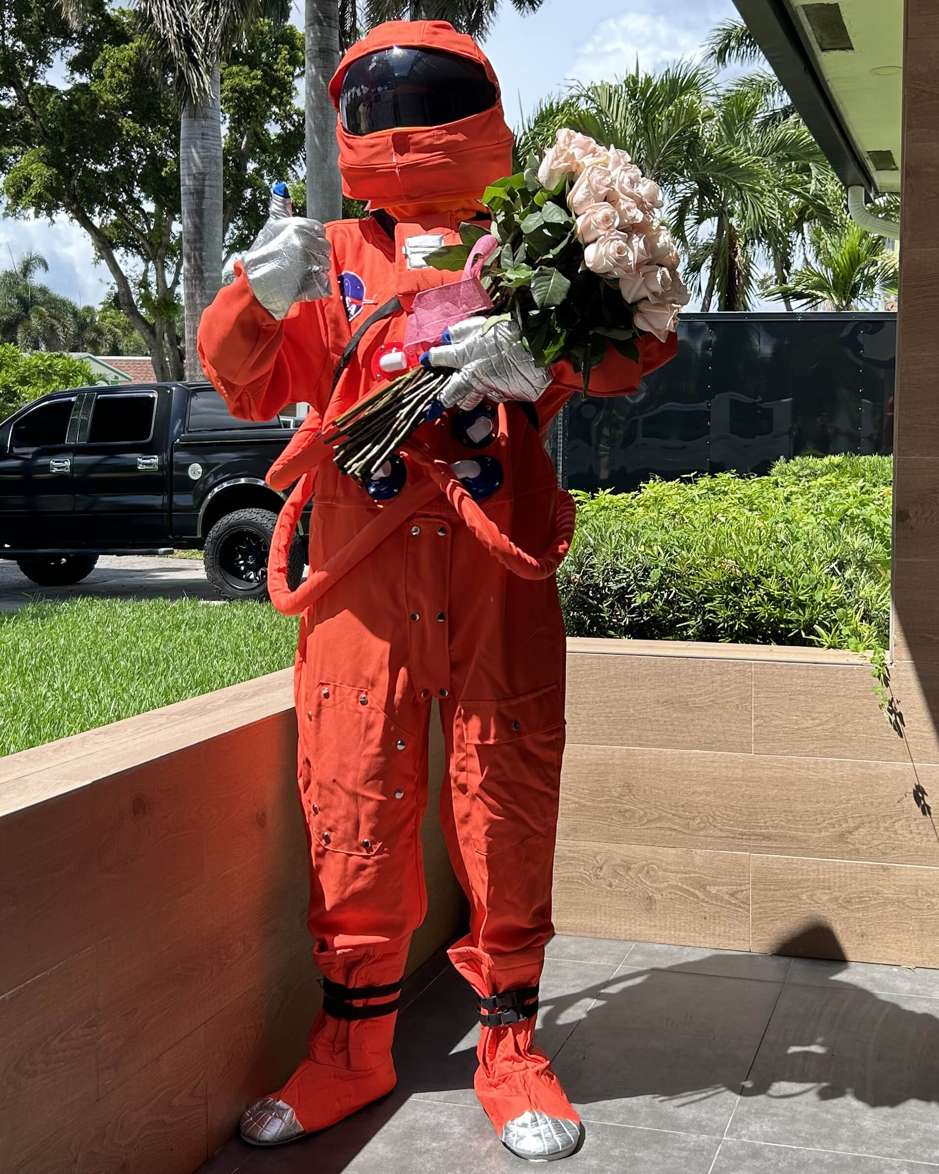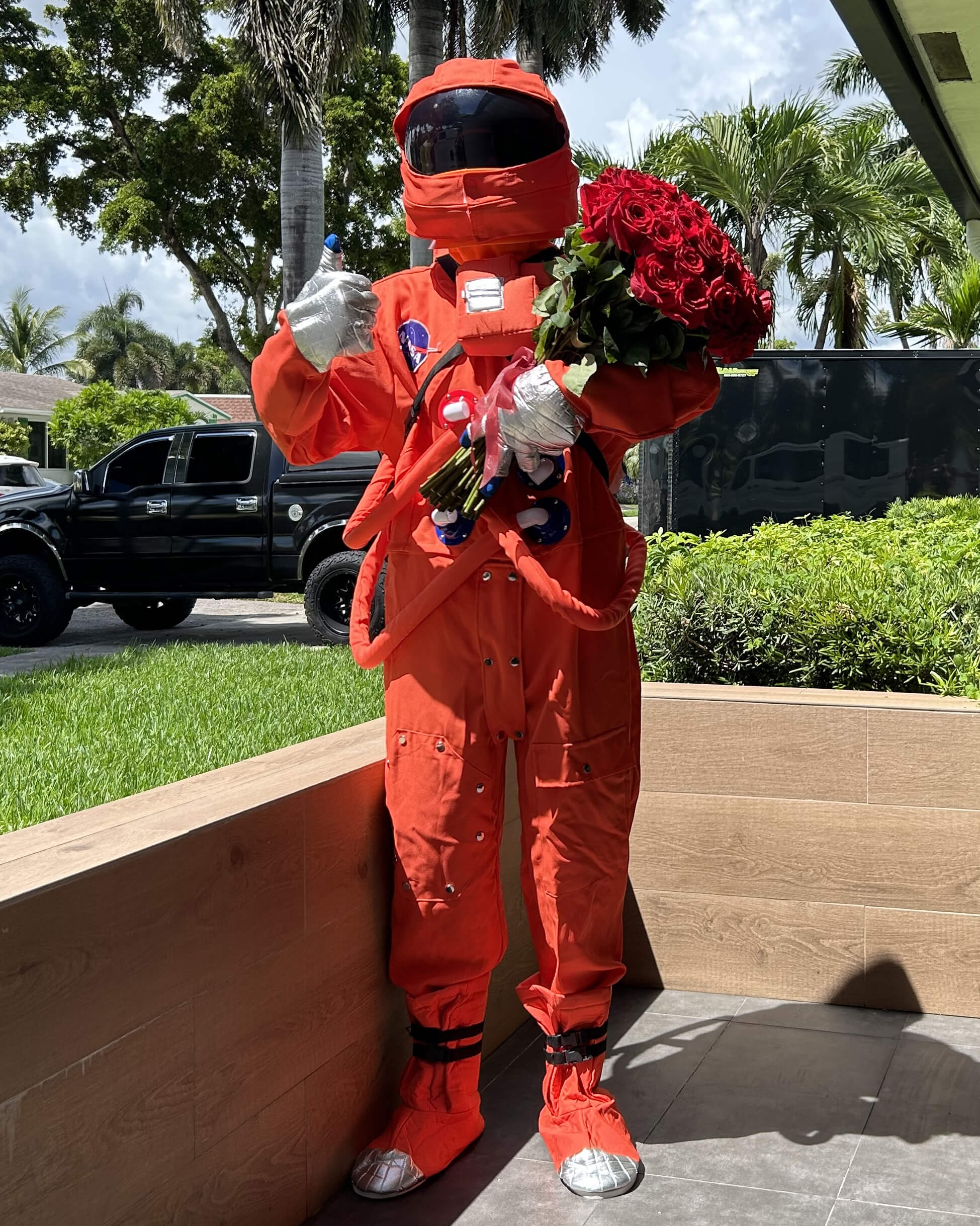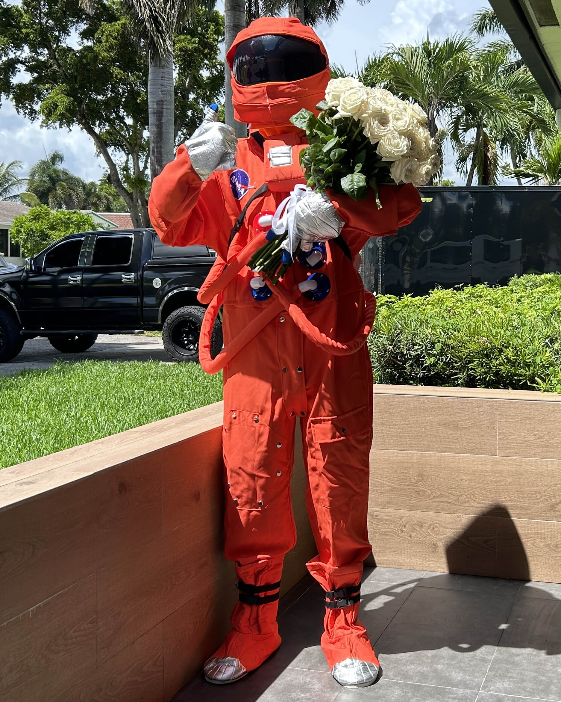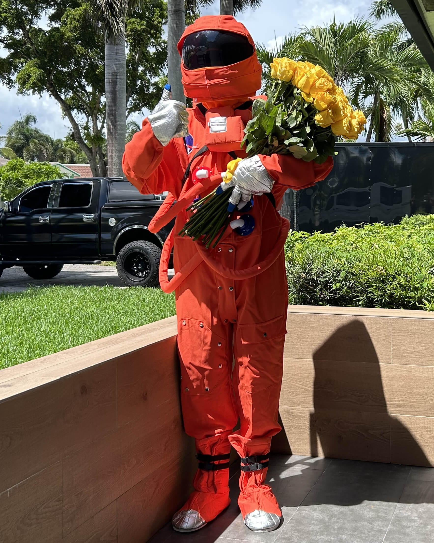 Delivery of fresh roses straight from orbit by a handsome astronaut in a bright red costume!